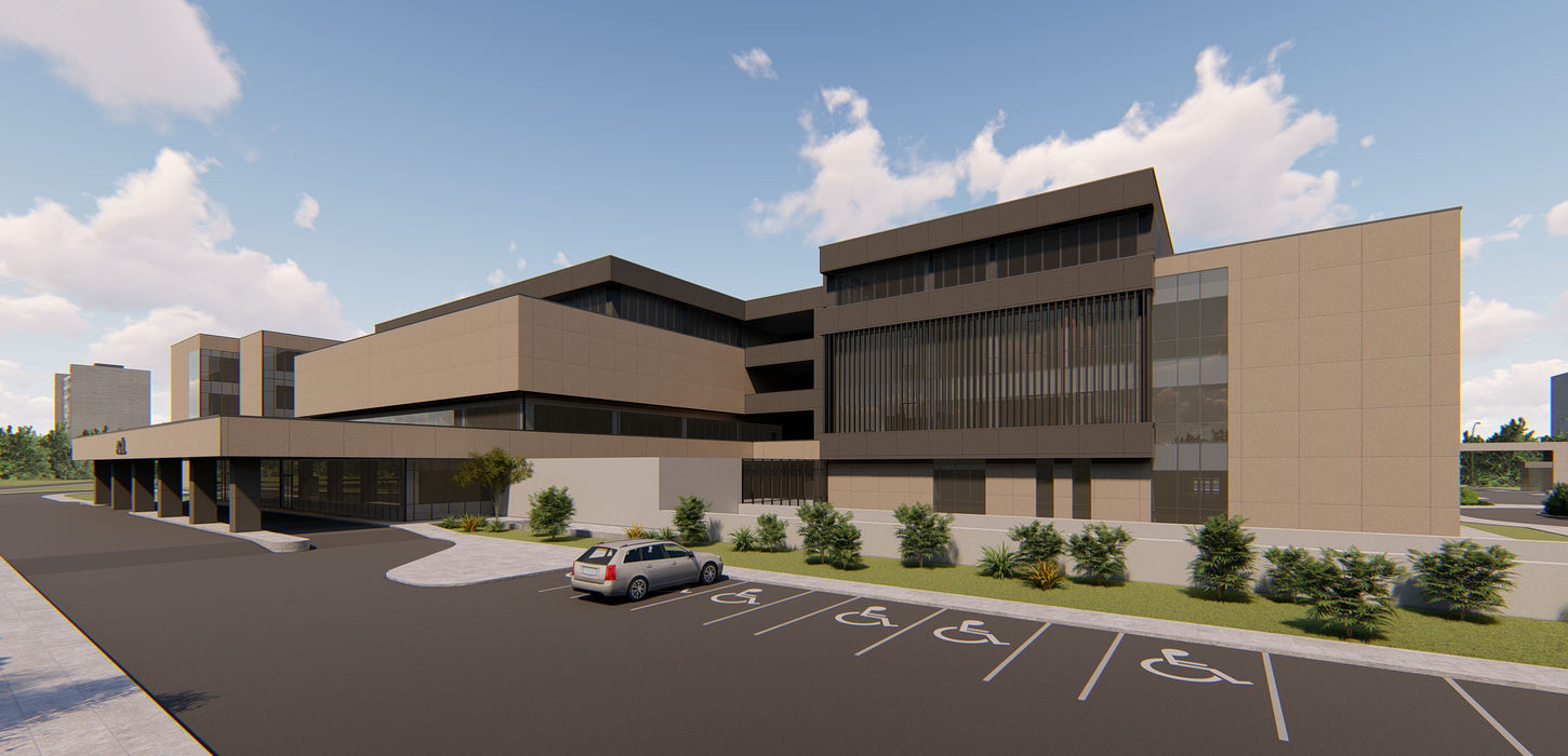 Adana’nın Seyhan ilçesinde bulunan 150 yataklı devlet hastanesi projesinde 42 adet poliklinik, 5 adet ameliyathane, 22 adet yoğun bakım ünitesi bulunur. Yapı temelinde deprem izolatörleri kullanılmıştır. Yapı 5 katlıdır, poliklinik, acil ve servis üniteleri olarak belirgin şekilde ayrılan kütleler, derin boşluklarla ayrılmış ve hava sirkülasyonu ve gölgeleme ile serin yüzeyler oluşturulmuştur. Fonksiyonların dışarıdan kolayca ayırt edilmesi amaçlanmış, erişilebilir ve anlaşılır bir kütle organizasyonu sağlanmıştır. Davetkar ana giriş ve acil girişi için geniş bir gölgelik alan oluşturan kolonatlı girişler tasarlanmıştır.